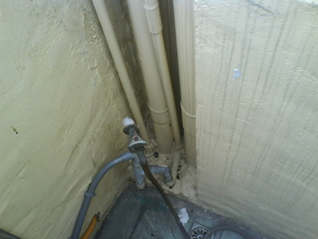 外墻│墻壁防水抓漏工程 ~~上圖中這么多管路的下方是漏水處,它的漏水源大致應(yīng)該是在這里沒有錯(cuò), 水是從哪里滲漏說真的沒有一個(gè)人可以確實(shí)地告訴你, 在施工上我們要以全面性防水施作的心態(tài), 可以防止水無孔不入的特性.